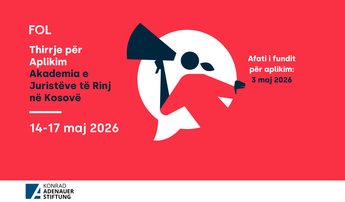 Lëvizja FOL ka kënaqësinë të njoftojë hapjen e aplikimeve për Akademinë e Juristëve të Rinj në Kosovë, që këtë vit organizohet për herën e tretë. Akademia 2026 do të mbahet nga data 14 deri më 17 Maj 2026, në Innovation and Training Park (ITP) në Prizren, dhe do të jetë e përqendruar në temën “Mbrojtja dhe përfaqësimi ligjor pranë gjykatave të larta vendore dhe ndërkombëtare”.